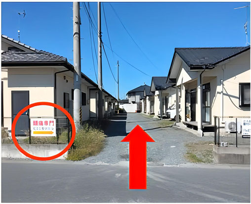 戸建ての建物(クリーム色)が8棟あり、当院は一番奥の右側となります。